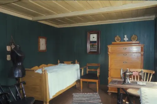 Sypikens rom i Johannesgate 12, 1891, konstruert på Norsk Folkemuseum , foto 1975. Ukjent fotograf | Norsk Folkemuseum