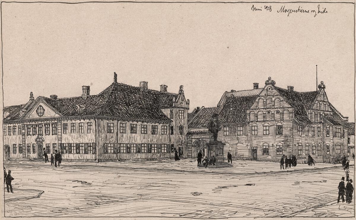 «Et nyt interiør fra det gamle Christiania». Forslag til plassering av Collettgården på Christiania Torv, tegnet av Morgenstierne & Eide. Fredrik Birkelund | Oslo Museum