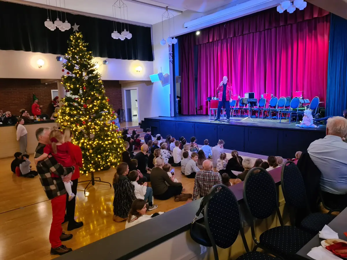 Juletrefest i Grorud Samfunnshus, med tryllekunstner på scenen. Ida Tolgensbakk