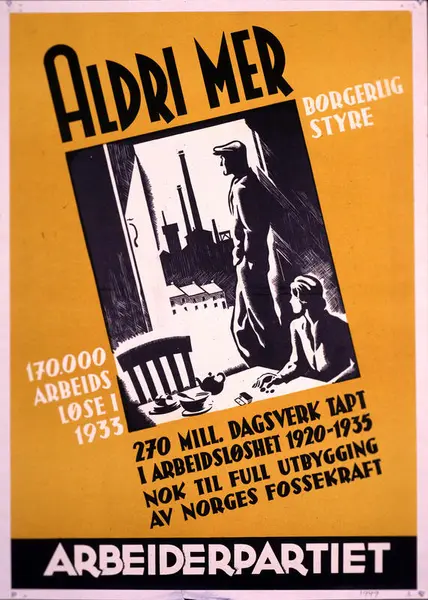 Valgplakat for Det norske Arbeiderparti fra 1949 med slagordet «ALDRI MER borgerlig styre». Mellomkrigstidens fattigdom og klassemotsetninger var fortsatt en realitet. Nå skulle det store målet – økonomisk vekst og velstand for alle – virkeliggjøres. Arbeiderbevegelsens bibliotek og arkiv.