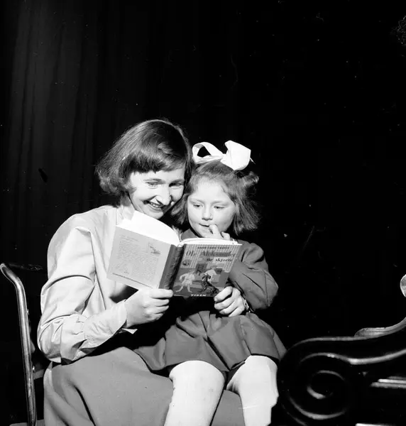 Anne-Cath. Vestly leser fra boka Ole Aleksander får skjorte, 1956. Den første Ole Aleksander-boka kom ut i 1953. Serien ble 1950-tallets viktigste norske barnebøker og har preget flere generasjoner barn. Dagbladet | Norsk Folkemuseum |