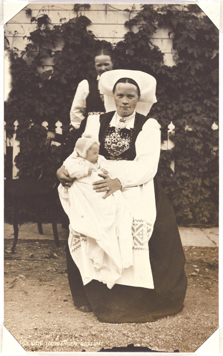 I Hardanger var skikken for gifte kvinner å bruke eit tett plissert skaut når dei skulle til kyrkje. I kvardagen var skautet enklare. Kyrkjekleda er vidareført i dagens bunad. Francis Frith | Norsk Folkemuseum