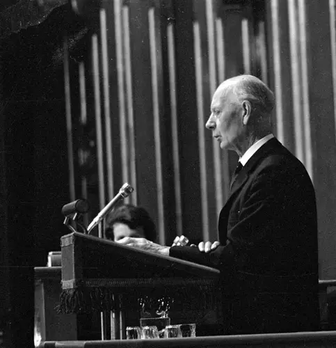 Einar Gerhardsen på talerstolen i Stortinget under trontaledebatten, oktober 1965. Ingen enkelt politiker har preget det norske samfunnet mer enn «landsfaderen» Einar Gerhardsen. Han ble selve personifiseringen av det sosialdemokratiske Norge og ga navn til en hel epoke – «gerhardsenperioden». Etter til sammen mer enn 17 år som statsminister gikk han av etter Arbeiderpartiets valgnederlag i 1965. JOHAN BRUN | DAGBLADSAMLINGEN - Norsk Folkemuseum
