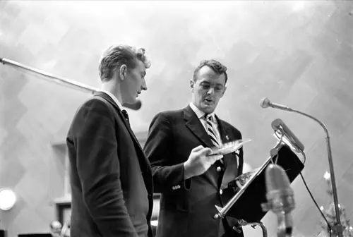 «Vi går om bord» med Erik Bye på TV, julaften 1962. 20. august 1960 startet Norge omsider med regulære fjernsynssendinger, som et av de siste land i den vestlige verden. Sendetiden var de første årene begrenset til noen timer daglig, og de fleste programmene bar sterkt preg av at NRKs hovedoppgave var å drive «folkeopplysning». Likevel gjorde de flimrende bildene i sort/hvitt den store verden utenfor til en del av folks dagligliv på en helt annen måte enn før. De bød også på passende doser etterlengtet underholdning. Johan Brun | Dagbladsamlingen - Norsk Folkemuseum