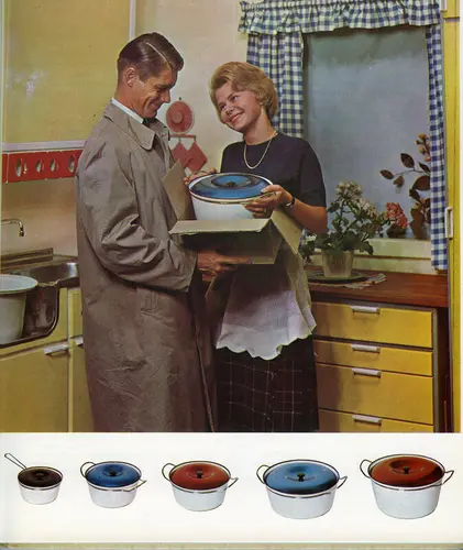 Kjøkkendrøm i 1965. Annonse for kasseroller fra a/s Cathrineholm i Halden i boka BO BEDRE – lev lettere, utgitt av Krigsinvalideforbundet i 1965. Husmoridealet sto fortsatt sterkt på 1960-tallet.