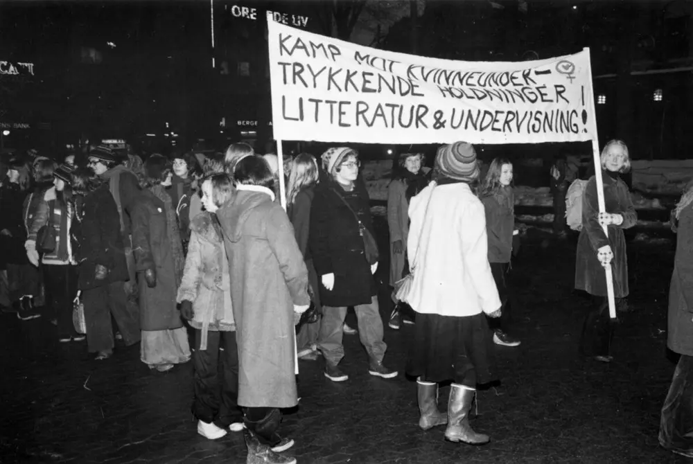 Demonstrasjonstog i Oslo, 8. mars 1977. Det var dette året 8. mars-markeringen i hovedstaden hadde størst oppslutning. Samarbeidskomiteens tog alene samlet ca. 4500 deltakere. I Norge ble kvinnedagen markert for første gang i 1915, men forsvant på slutten av 1920-tallet. Den nye kvinnebevegelsen tok tradisjonen opp igjen i 1972. Kvinnebevegelsen var den av 1970-tallets protestbevegelser som fikk raskest og mest politisk gjennomslag, og det var slett ikke bare de politisk venstreradikale som stilte seg bak parolene. Ukjent fotograf | Norsk Folkemuseum