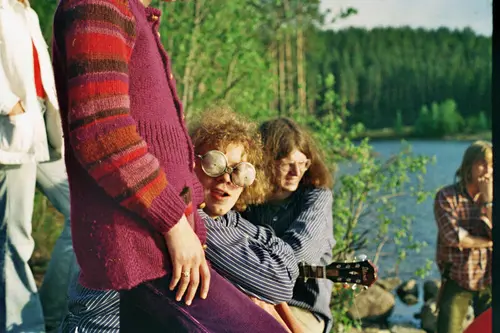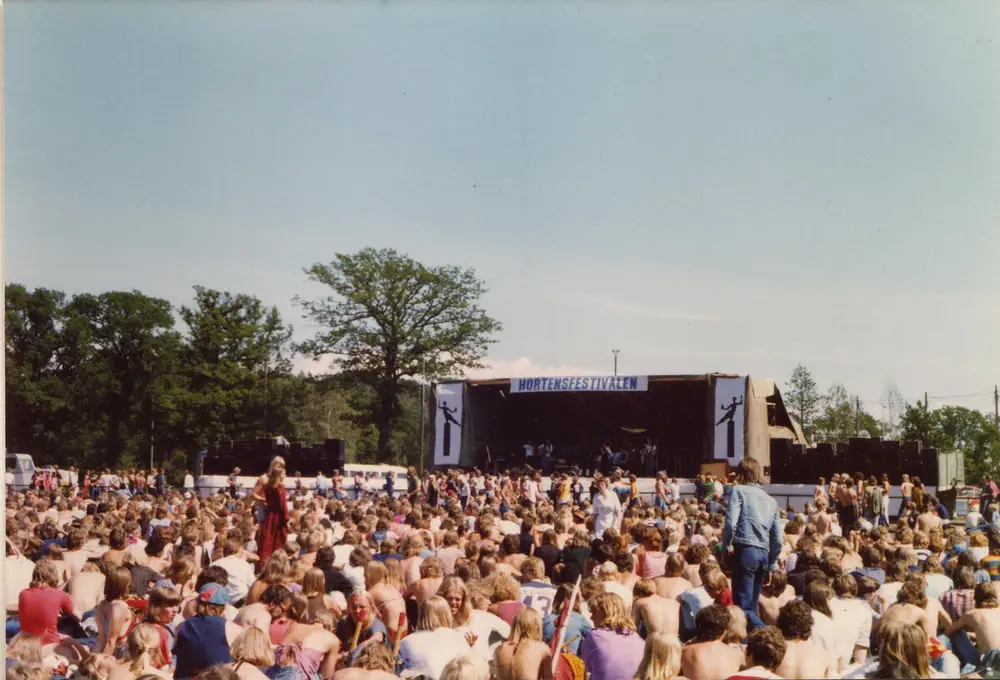 Ungdom på Hortensfestivalen, 1977. På scenen kan en skimte folkrockgruppa Folque. Woodstockfestivalen i USA i 1969 ble forbildet for norske rockefestivaler. Blant de tidligste var frikonserten på St. Hanshaugen i Oslo sommeren 1971 og Kalvøyafestivalen, som startet samme år. Ragnarockfestivalen i Holmenkollen fulgte etter i 1973. Rockefestivalene er kanskje hippiebevegelsens varigste bidrag til kulturen. Hortensfestivalen, som ble arrangert for første gang i 1975, eksisterer (etter et lengre opphold) fremdeles. Bjørn Amundsen | Norsk Folkemuseum