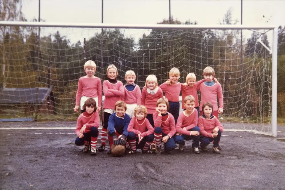 Røa mygglags aller første kamp, Røa grusbane høsten 1974. Røa vant 1–0 over Asker! To av de mest karakteristiske trekkene ved 1970-tallet er «demokratiseringen» av kulturen og den fastere organiseringen av barns fritid. I kulturlivet skulle alle være med og skillet mellom amatørkultur og seriøs kultur oppheves – også idrett ble kultur som fikk offentlig støtte. Idretten var dessuten tidlig ute med å tilrettelegge barnas deltakelse på en måte som krevde stor innsats fra foreldrene, blant annet kjøring til og fra trening og konkurranser Ukjent fotograf | Norsk Folkemuseum