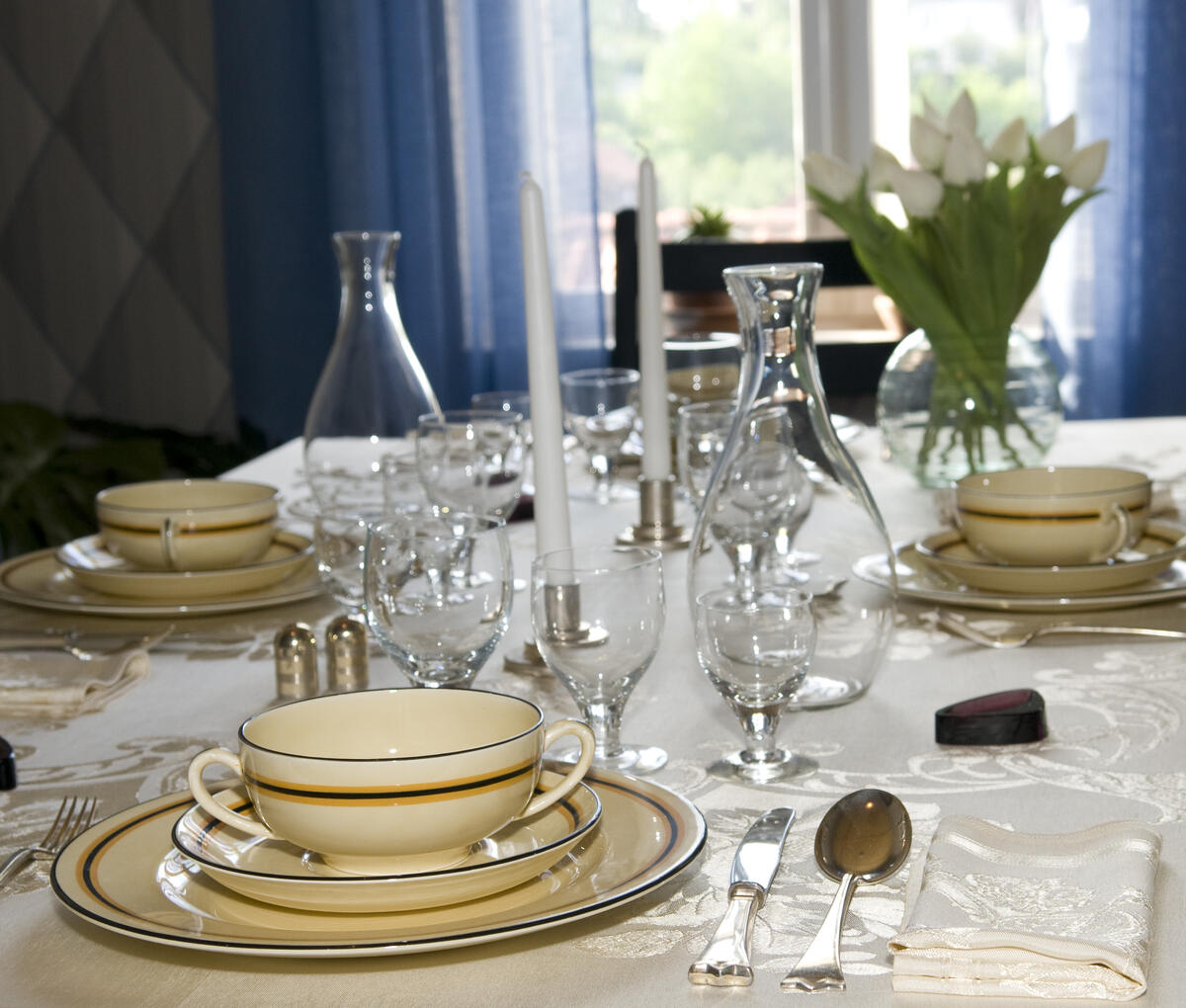 Spisebordet hos Evelyn Berg er dekket til selskapsmiddag med et tidstypisk art deco-servise med enkel fargedekor. Glassene er laget på Hadeland Glassverk og tilhører en serie som ble produsert fra 1932 under navnet Adolf, men som etter annen verdenskrig byttet navn til Arvid. De hvite tulipanene i vasen er blant de få blomstene, ved siden av kaktus, som var «godkjent» av funksjonalistene. Anne.Lise Reinsfelt | Norsk Folkemuseum