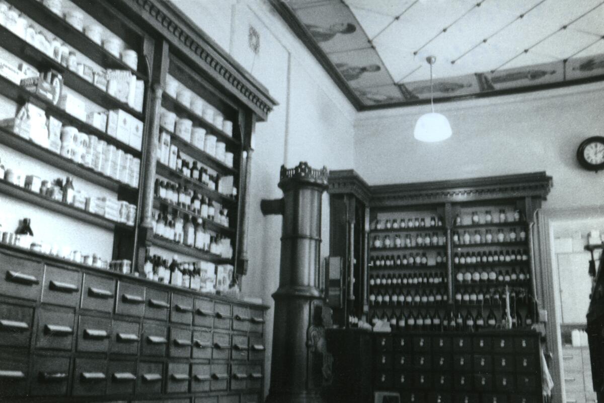 Interiør fra Svaneapoteket Larvik med en del av glasstaket. Norsk Folkemuseum