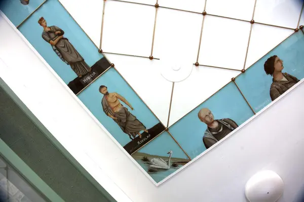 Det kan se ut til at Jens Thorsen har fått en liste over navn på de som skulle portretteres, med fødsels- og dødsår der disse var kjent, og at han ellers har fått utfolde seg ganske fritt. Taket er et hvitt glasstak, cirka 7,5 x 4,5 meter, delt opp med et rutemønster på 48 x 48 cm av 1 cm brede messingstenger. Rundt kantene har taket bilder av personer som er mer eller mindre kjent i medisin- og farmasihistorien. Bildene er malt på blått glass, og er 90 x 48 cm. De er også atskilt med messingstenger. I hjørnene er det bilder av svaner, 48 x 48 cm, og det er fire lampepunkter litt inn fra hjørnene.