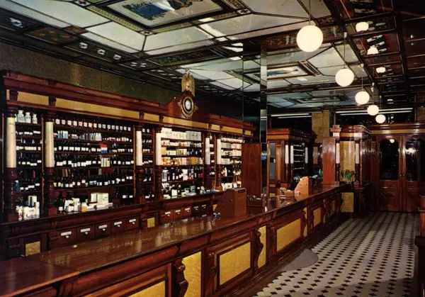 Svaneapotheket i Oslo er ett av tre fredete apotekinventar i Norge. Det ble opprettet i 1628, men dagens anlegg er fra 1896. Glasstaket er malt av Wilhelm Krogh. Det er i dag ikke apotekdrift i lokalene. Postkort fra Knut Aune Kunstforlag A/S. Norsk Folkemuseum