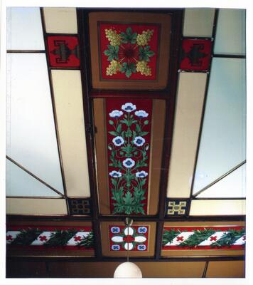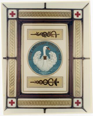 Utsnitt av glasstaket fra Svaneapoteket Larvik med Hygiea, Æskulap, Scipio og Mithridates. Hvert hjørnefelt er dekorert med en svane. Eva Brænd | Norsk Folkemuseum