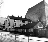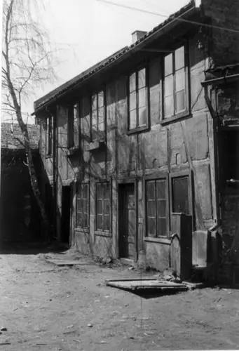 Bakgårdsbygningen i Holmengata 5, 1957. Vaskekonen Gunda Eriksen bodde nesten 30 år av sitt liv i en toroms leilighet på ca. 50 m2 i denne gården. Bildet er tatt kort før den ble revet i forbindelse med saneringen av Vestre Vika. Arne Berg | Norsk Folkemuseum
