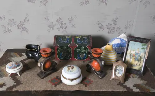 På kommoden i dagligstua hadde Gunda satt fram ulike pyntegjenstander. Til høyre ses et lite innrammet fotografi av mannen hennes, Olaf Eriksen. Blant gjenstandene er også noen av de få tingene Gunda kan ha anskaffet etter annen verdenskrig, blant annet serviettholderen av plast og den kuleformede blomstervasen med gul dekor i konsentriske ringer. Anne-Lise Reinsfelt | Norsk Folkemuseum