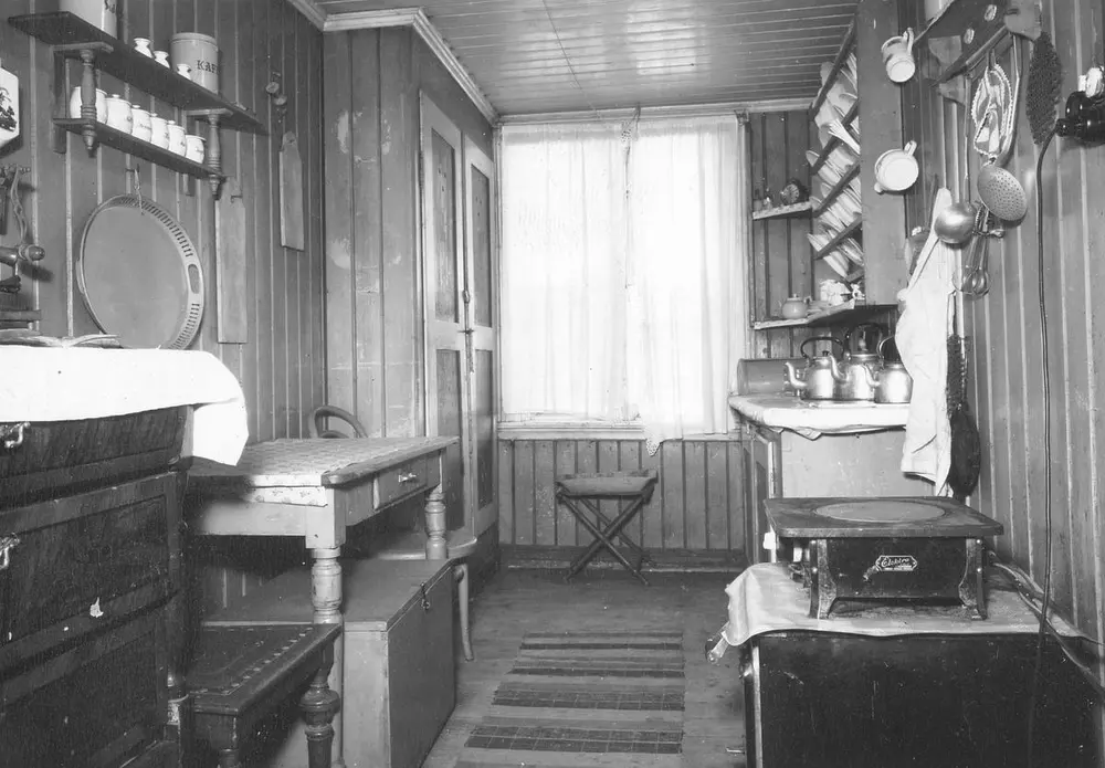 Kjøkkenet har, som i Holmengata 5, fått utslagsvask og innlagt kaldt vann, men ikke varmtvannsbereder. Vann ville blitt varmet i den store kjelen på kokeplata.