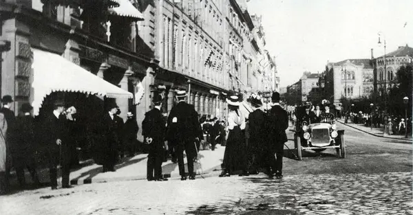 Karl Johans gate i Kristiania, sommeren 1905. Norges hovedstad hadde på dette tidspunktet nylig vokst til en storby og fått et visst mondent preg. Den elektriske sporveien – trikken – bidro til å gjøre gatebildet moderne. Byen fikk sin første elektriske trikkelinje (Briskebytrikken) i 1894. Mindre enn ti år senere hadde tilbudet vokst til 12 linjer med nesten 200 vogner. Tre forskjellige selskaper sto for driften. Ukjent fotograf | Norsk Folkemuseum