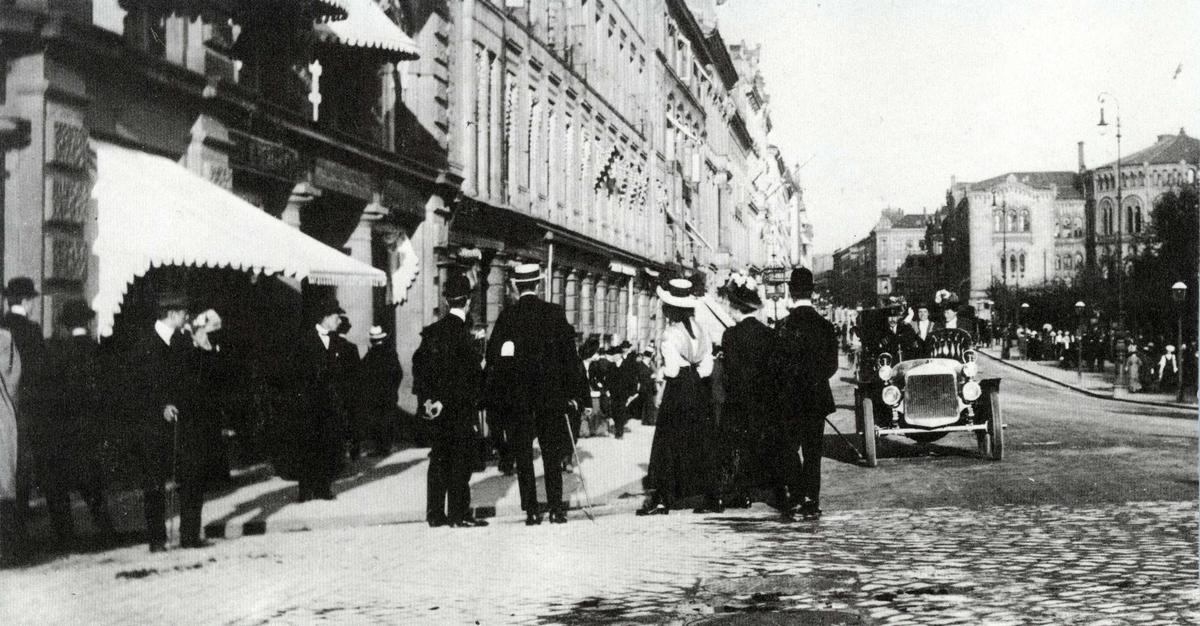 Bil på Karl Johans gate, 1908. H. C. Neupert | Norsk Folkemuseum