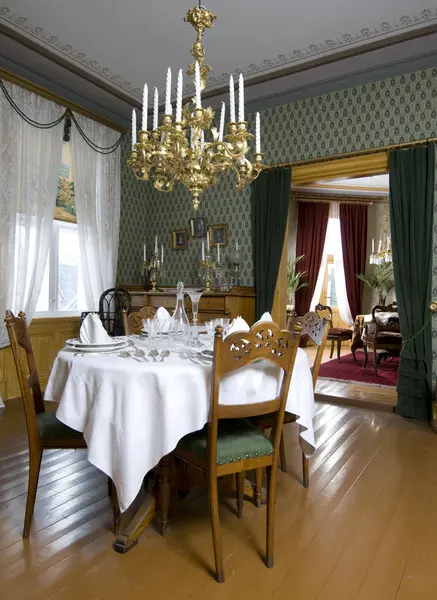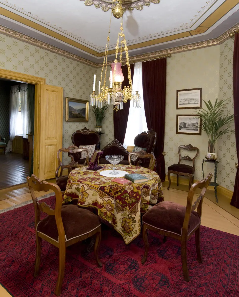 Familien Helmers spisestue med nygotisk møblement av eik og stoltrekk i ulldamask. Nygotikken var den første av «nystilene» og allerede gammeldags i 1879. Møblementet har opprinnelig tilhørt amtveimester Wilhelm Frimann Koren Christie (1824–1918). Anne-Lise Reinsfelt | Norsk Folkemuseum