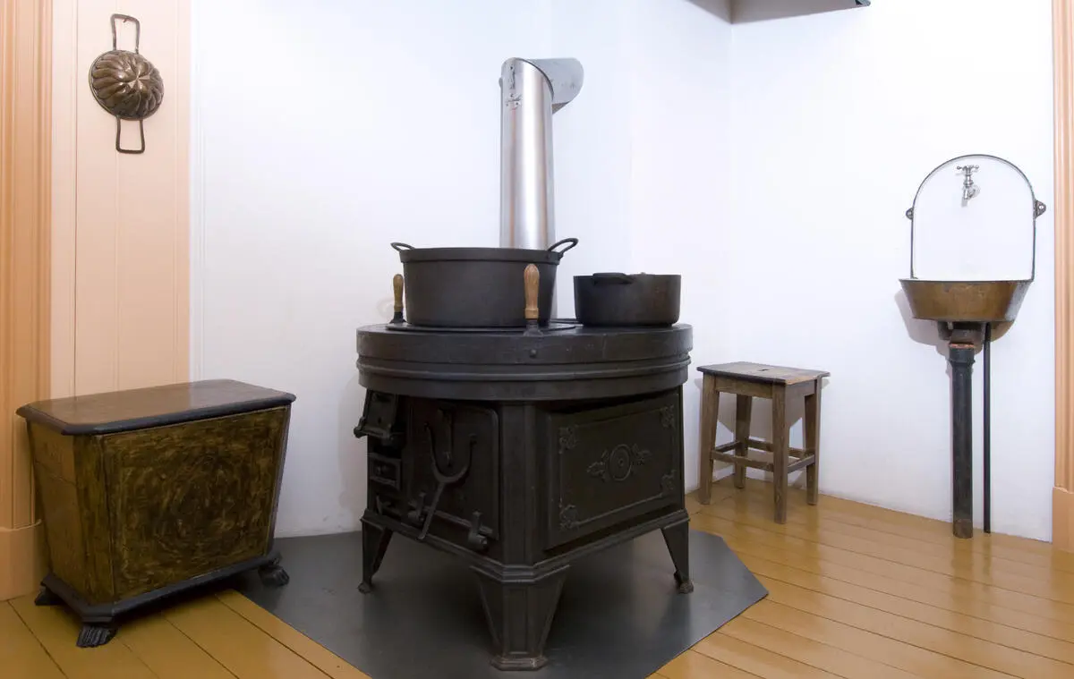 Utslagsvask og komfyr i kjøkkenet hos familien Helmer. Begge er iøynefallende forskjellig fra de typene som ble vanlige noen tiår senere. Blant annet mangler utslagsvasken fortsatt vannlås. Branntaksten for Wessels gate 15 fra 1877 viser at kjøkkenene var utstyrt med både komfyr og utslagsvask med kran helt fra gården ble bygd i 1865, noe som var svært moderne på det tidspunktet. Anne-Lise Reinsfelt | Norsk Folkemuseum