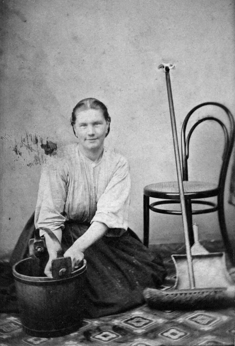 Tjenestepike, atelierfotografi av Christian Wærenskjold i Porsgrunn fra 1866. I 1900 bodde forøvrig fotografens enke Laura sammen med sin søster i Wessels gate 15! Norsk Folkemuseum