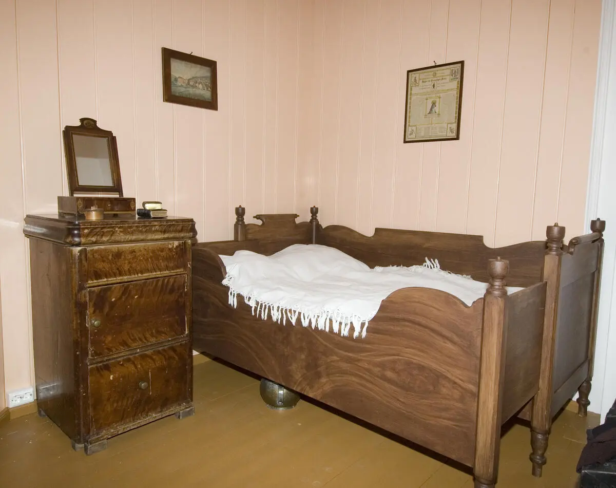 Pikeværelset har uttrekkbar seng med plass til to piker. Kommoden var tjenestepikens egen og inneholdt alt hun eide. Bibelen og salmeboka har hun lagt på toppen. Anne-Lise Reinsfelt | Norsk Folkemuseum